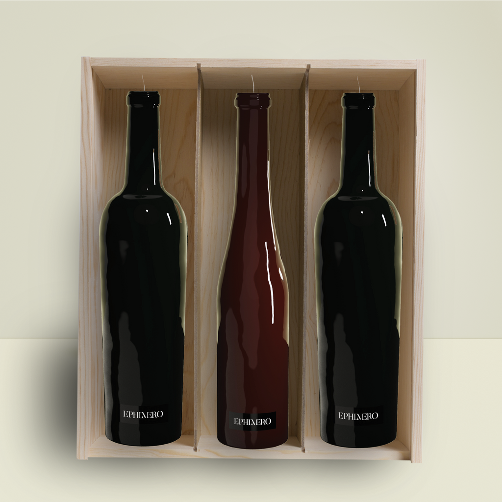 3 Velas esculturales con forma de botella en caja de madera de pino grabada.